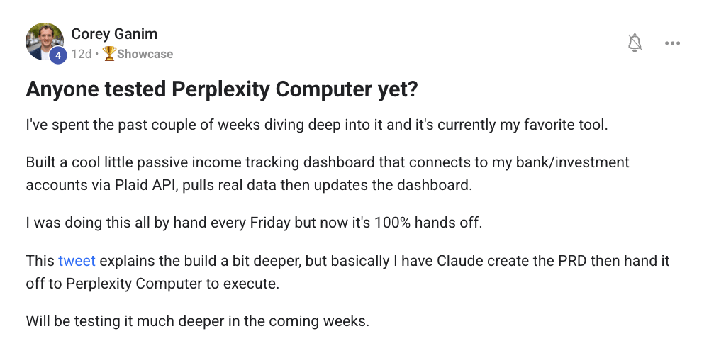 #6 Passive income dashboard with Perplexity Computer - Corey Ganim built a passive income tracking dashboard that connects to real bank/investment accounts via Plaid API and updates automatically. What used to be a manual Friday task is now 100% hands-off. Practical automation at its finest! Corey’s step by step workflow is here…