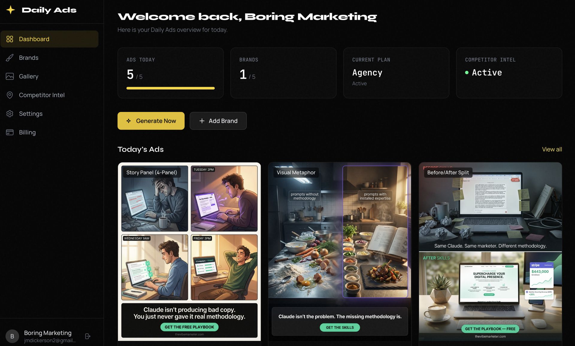 b. I built a product on a boat in 48 hours. My ads were working. The hard part? Creatives. Now I get fresh, optimized ads every day brand-aware, competitor-informed, preference-trained. Copy handled. Formats proven. Delivered on autopilot. Try ads.thevibemarketer.com and let me know what you think.