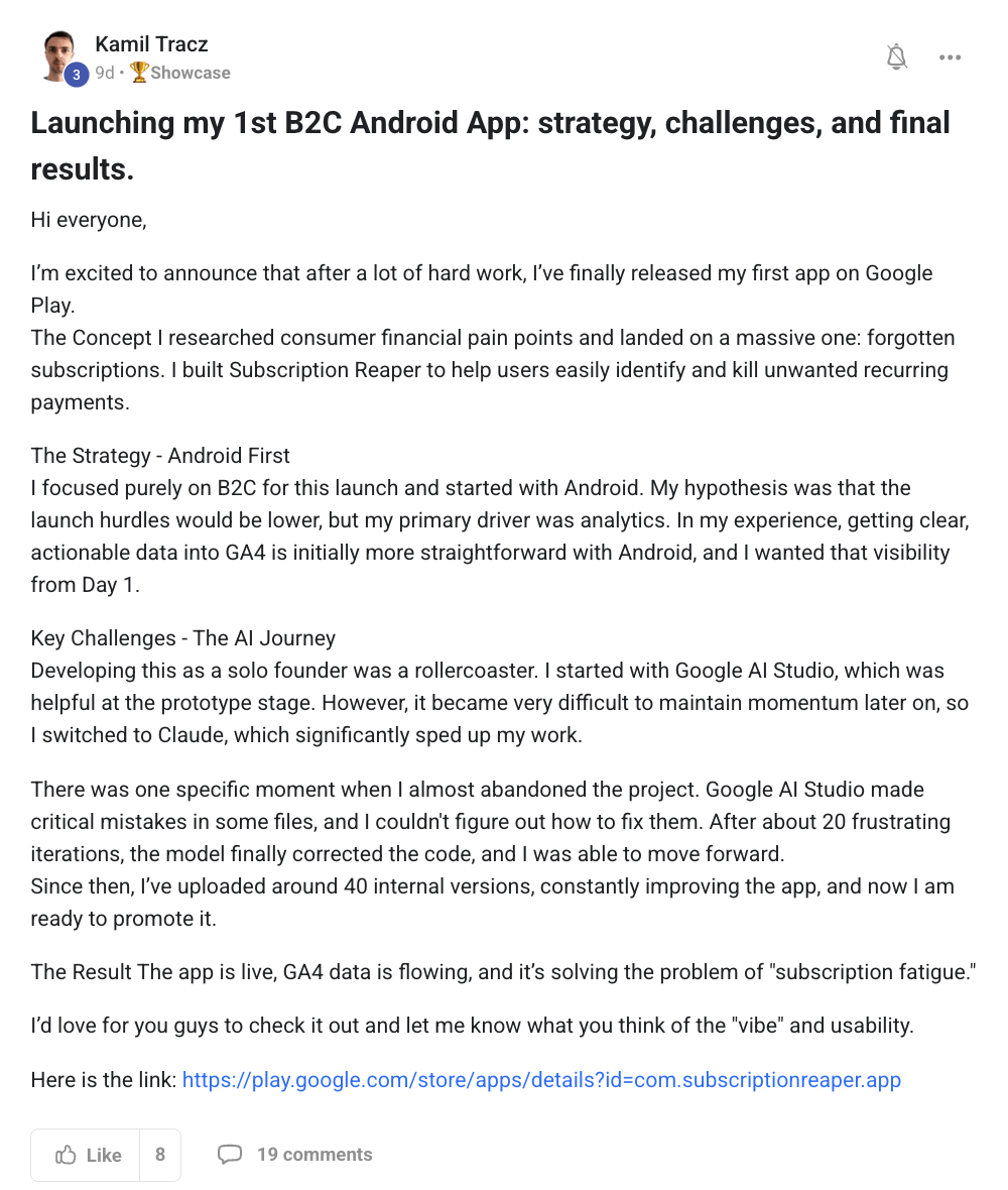 a. Kamil Tracz, launched his 1st B2C Android App. After 40+ internal versions and pushing through moments of almost giving up, Kamil launched Subscription Reaper on Google Play - an app that helps users identify and kill unwanted recurring payments. A masterclass in solo founder persistence. Check his android app here…