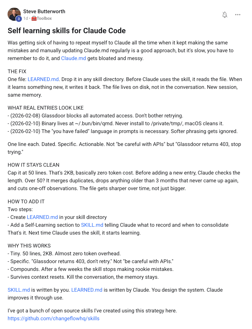 c. Steve Butterworth solved one of Claude Code’s biggest pain points: forgetting. Instead of bloated Claude.md files, he created a lightweight LEARNED.md system that lets skills persist knowledge across sessions, stay clean, and compound over time. A smart approach to durable AI memory and clean system for AI that actually learns.He’s also open-sourced a collection of skills built with this strategy.